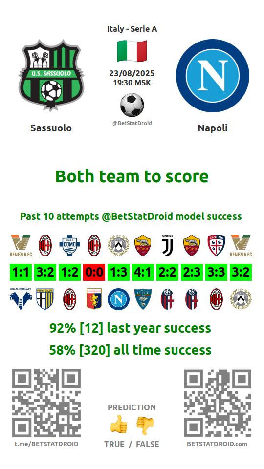 ✔ Сассуоло забивает меньше 1,5 голов в 6 матчах