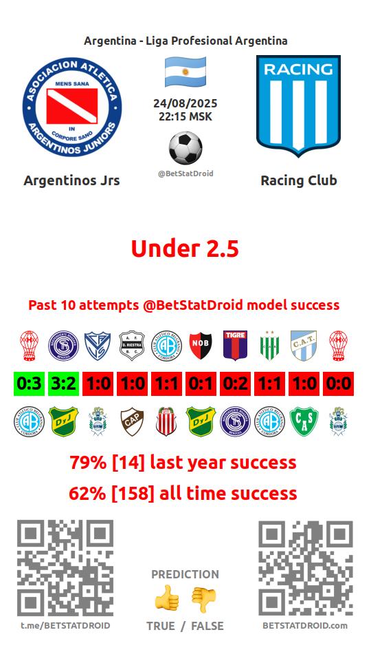 ✔ Расинг Авельянеда забивает меньше 2,5 голов в 10 матчах