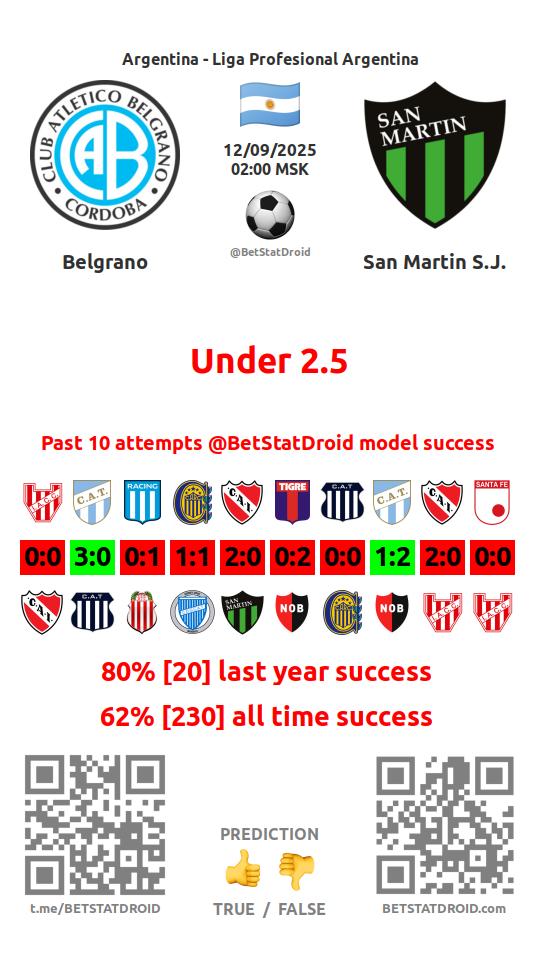 ✔ Бельграно забивает меньше 2,5 голов в 13 матчах