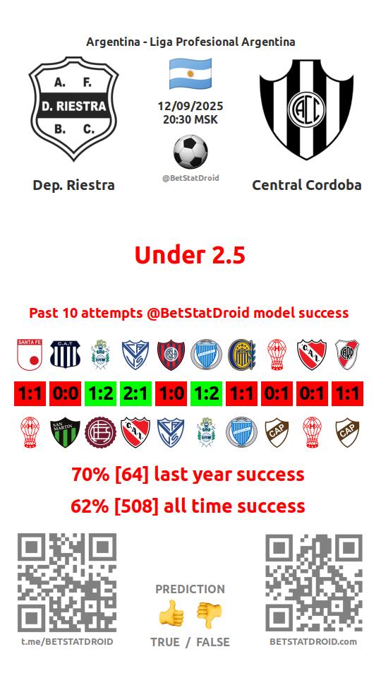 ✔ Депортиво Риестра пропускает меньше 2,5 голов в 16 матчах