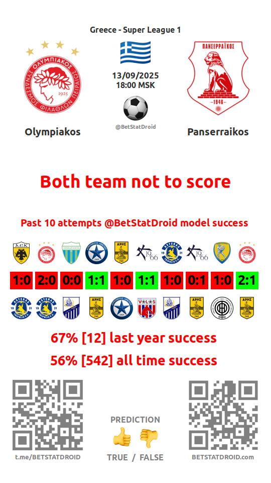 ✔ Олимпиакос пропускает меньше 2,5 голов в 43 матчах
