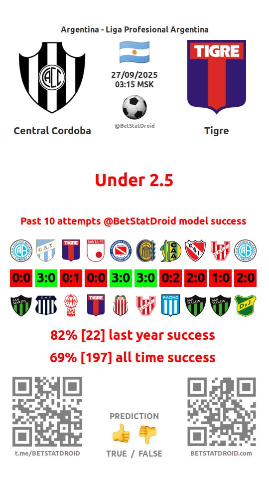 ✔ Сентраль Кордоба пропускает меньше 2,5 голов в 9 матчах