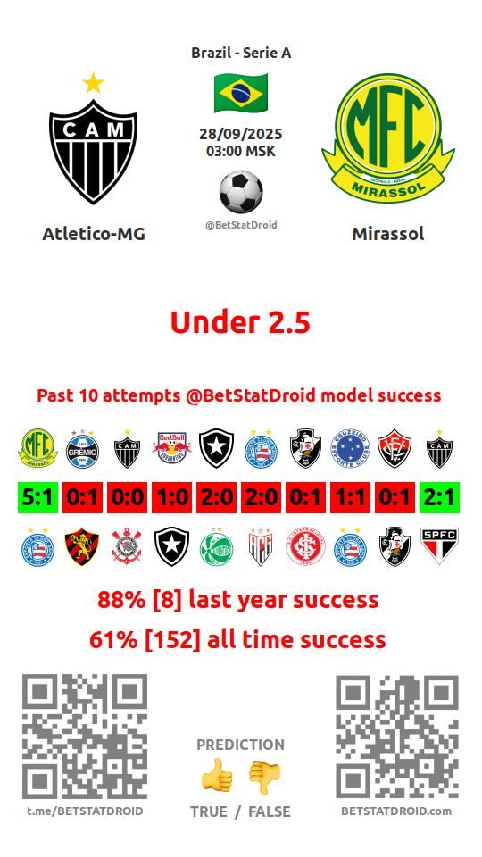 ✔ Атлетико Минейро забивает меньше 2,5 голов в 14 матчах
