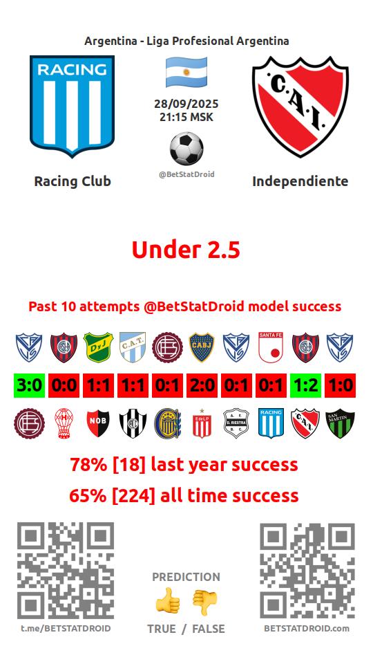 ✔ Расинг Авельянеда забивает меньше 2,5 голов в 10 матчах
