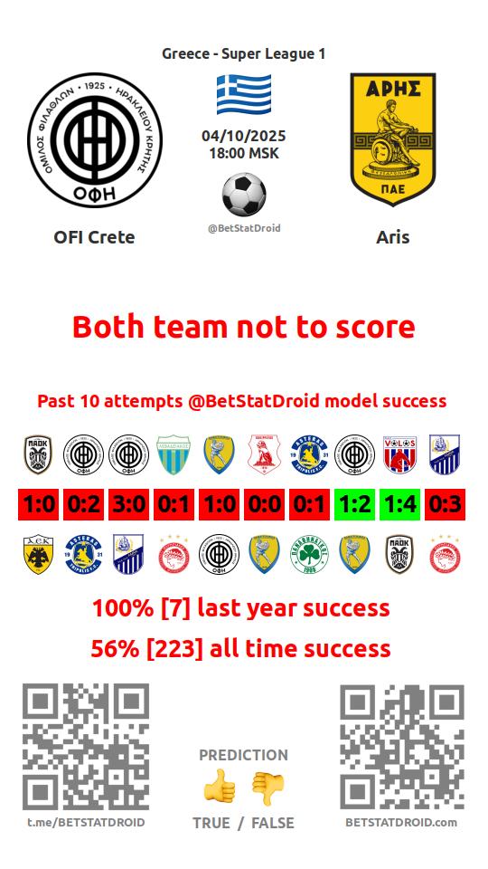 ✔ ОФИ Крит забивает меньше 1,5 голов в 5 матчах