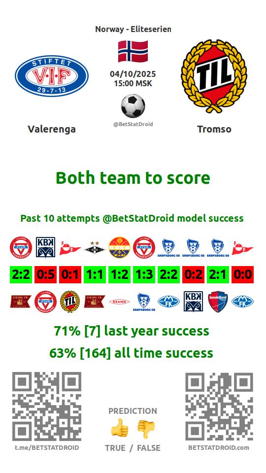 ✔ Тромсе забивает меньше 1,5 голов в 10 матчах