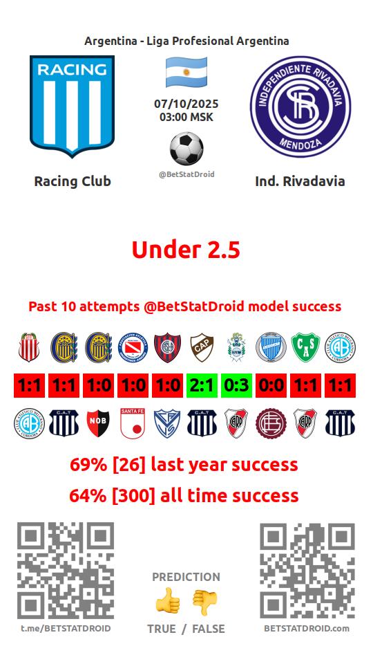 ✔ Расинг Авельянеда забивает меньше 2,5 голов в 15 матчах