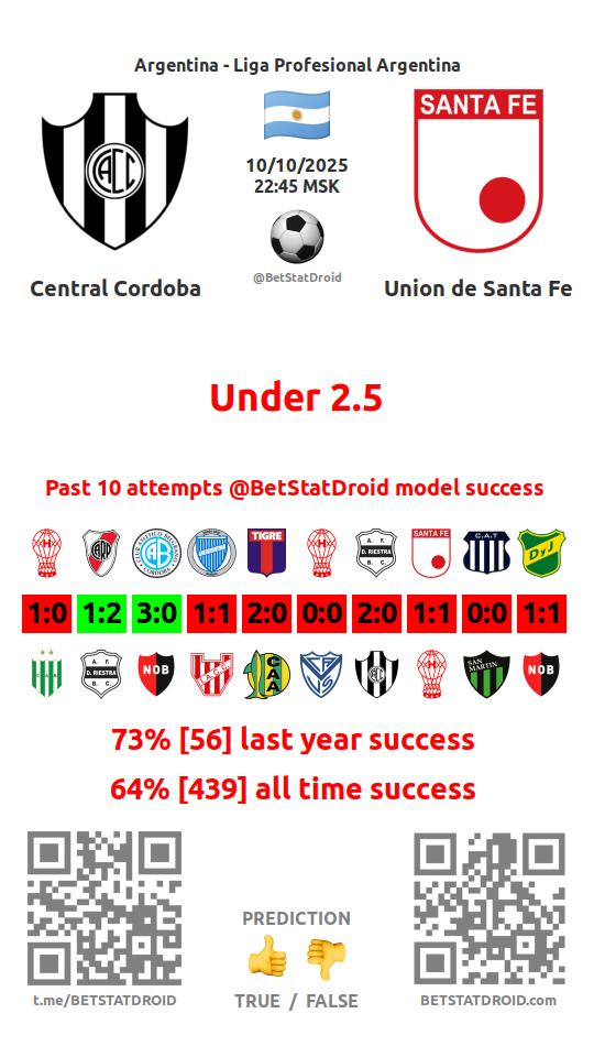 ✔ Сентраль Кордоба забивает меньше 2,5 голов в 9 матчах