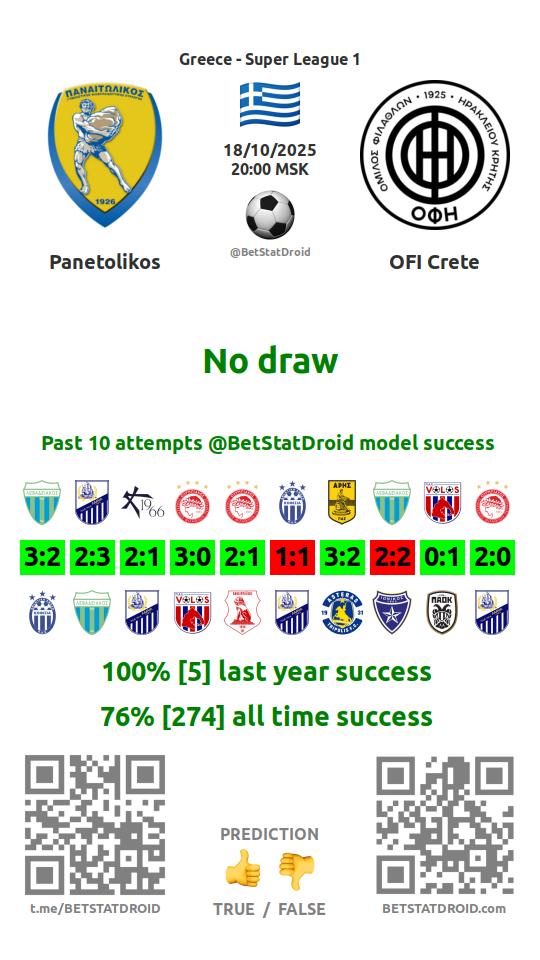 ✔ Панэтоликос забивает меньше 2,5 голов в 18 матчах