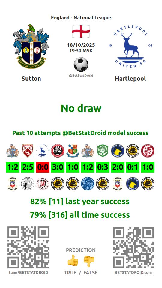 ✔ Саттон Юнайтед забивает меньше 1,5 голов в 5 матчах