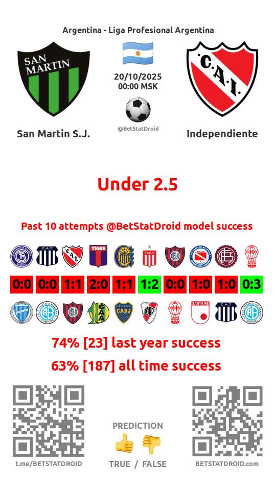 ✔ Сан-Мартин Сан-Хуан забивает меньше 2,5 голов в 10 матчах