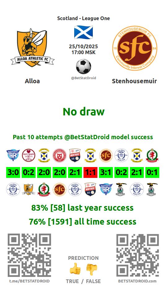 ✔ Аллоа Атлетик забивает меньше 2,5 голов в 15 матчах