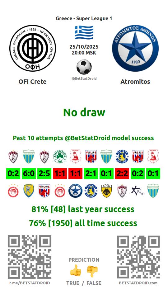 ✔ ОФИ Крит забивает меньше 1,5 голов в 7 матчах