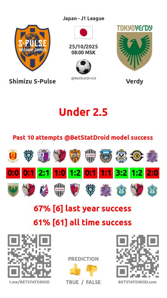 ✔ Токио Верди забивает меньше 2,5 голов в 21 матчах