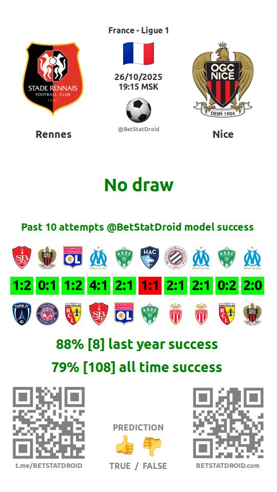 ✔ Ренн забивает меньше 2,5 голов в 26 матчах