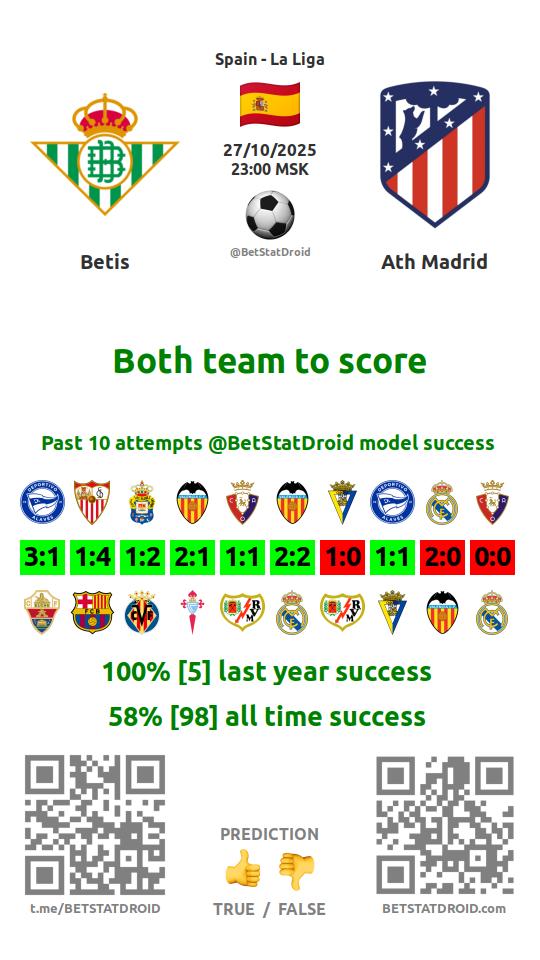 ✔ Бетис забивает меньше 1,5 голов в 23 матчах