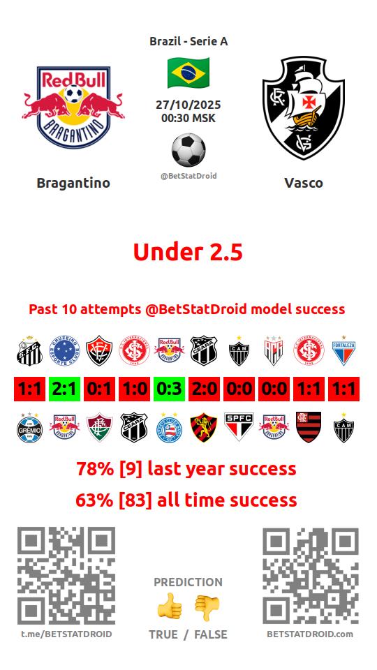 ✔ Ред Булл Брагантино забивает меньше 2,5 голов в 8 матчах