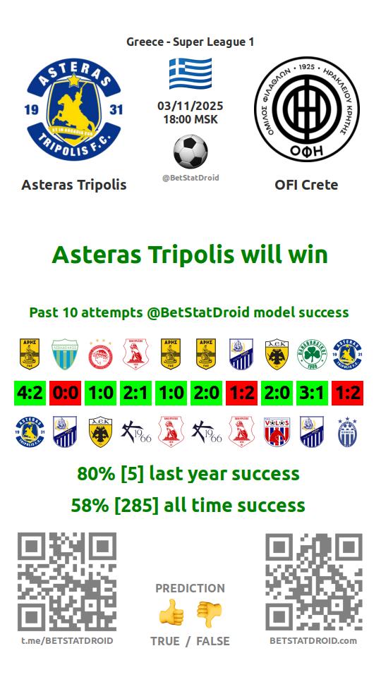 ✔ ОФИ Крит забивает меньше 1,5 голов в 12 матчах