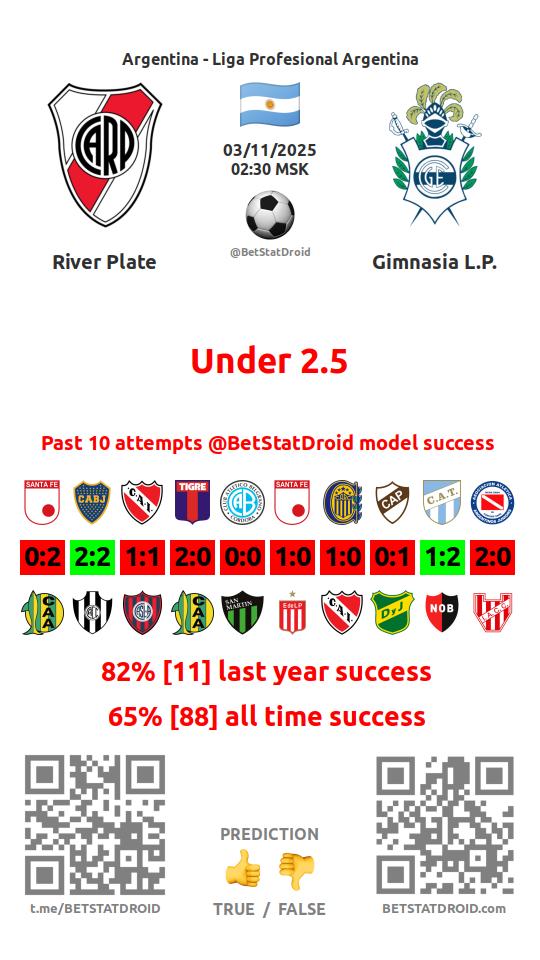 ✔ Химнасия Ла-Плата забивает меньше 2,5 голов в 25 матчах