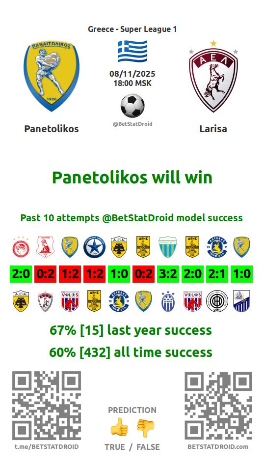 ✔ Панэтоликос забивает больше 1,5 голов в 6 матчах