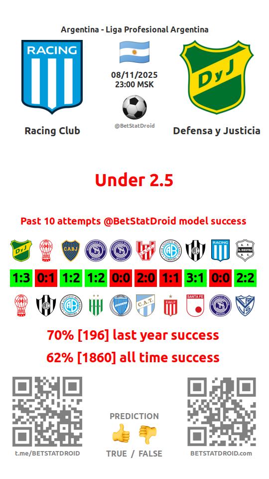 ✔ Расинг Авельянеда забивает меньше 2,5 голов в 11 матчах