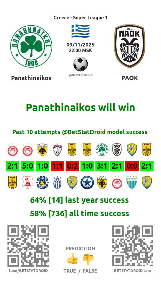 ✔ Панатинаикос забивает меньше 2,5 голов в 11 матчах