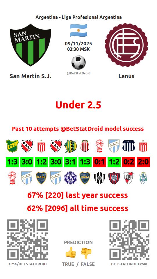 ✔ Сан-Мартин Сан-Хуан забивает меньше 2,5 голов в 12 матчах