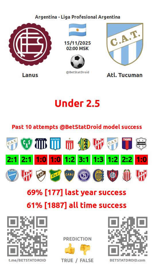 ✔ Ланус забивает меньше 2,5 голов в 22 матчах