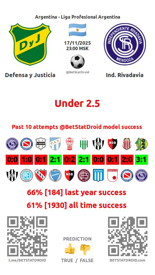 ✔ Дефенса и Хустисия забивает меньше 2,5 голов в 34 матчах