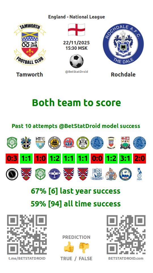 ✔ Тэмуорт забивает меньше 1,5 голов в 7 матчах