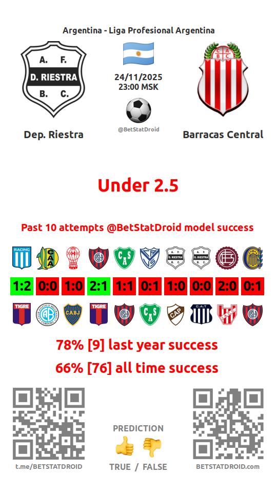 ✔ Барракас Сентраль забивает меньше 2,5 голов в 12 матчах