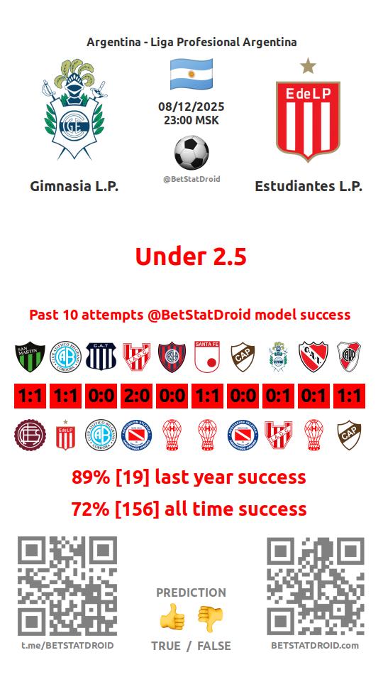 ✔ Химнасия Ла-Плата забивает меньше 2,5 голов в 8 матчах