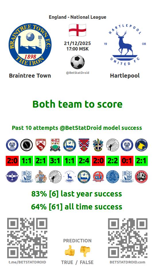 ✔ Брэйнтри Таун забивает меньше 2,5 голов в 12 матчах