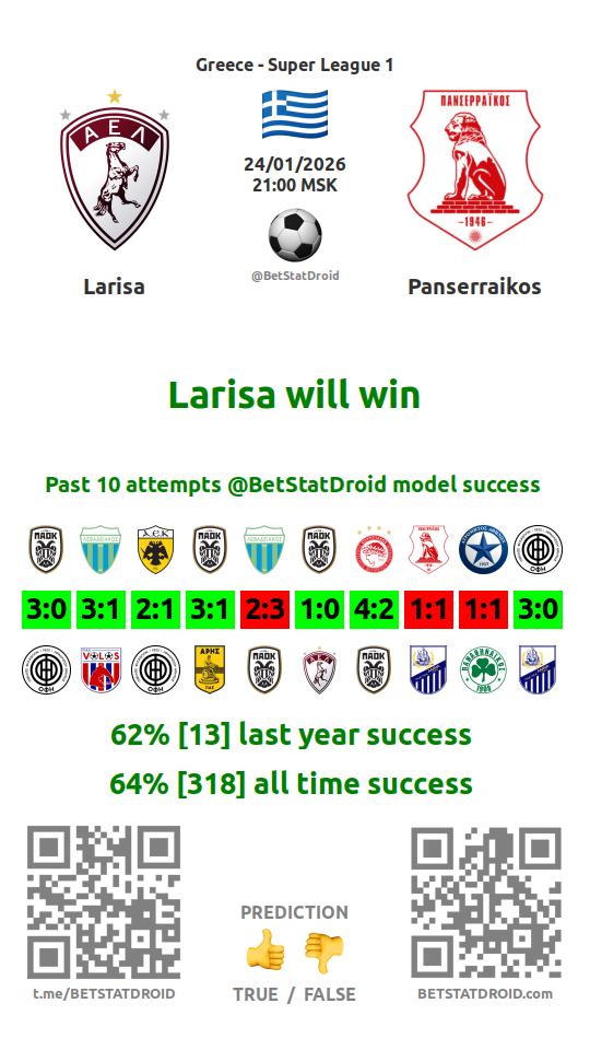 ✔ Лариса забивает меньше 2,5 голов в 26 матчах