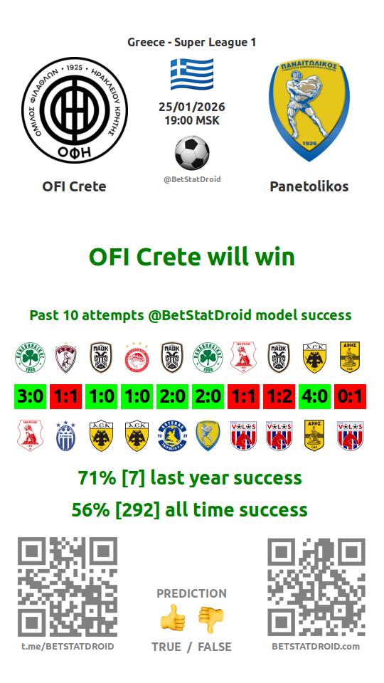 ✔ ОФИ Крит забивает меньше 2,5 голов в 8 матчах