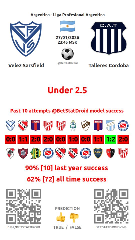 ✔ Велес Сарсфилд пропускает меньше 2,5 голов в 53 матчах