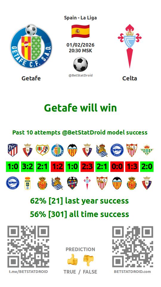 ✔ Хетафе забивает меньше 1,5 голов в 10 матчах