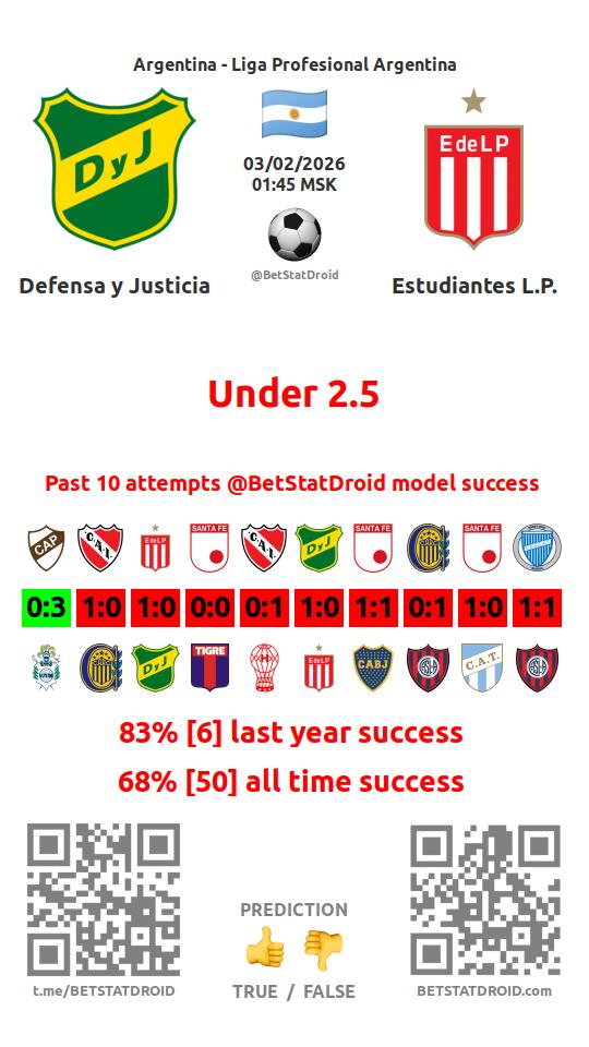 ✔ Дефенса и Хустисия забивает меньше 2,5 голов в 32 матчах