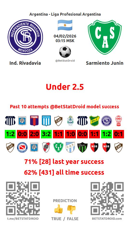 ✔ Индепендьенте Ривадавия забивает меньше 2,5 голов в 17 матчах