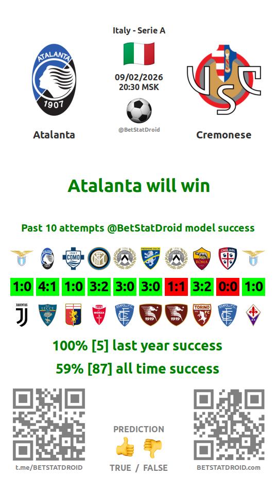 ✔ Аталанта пропускает меньше 1,5 голов в 9 матчах