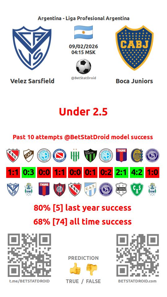 ✔ Велес Сарсфилд забивает меньше 2,5 голов в 10 матчах