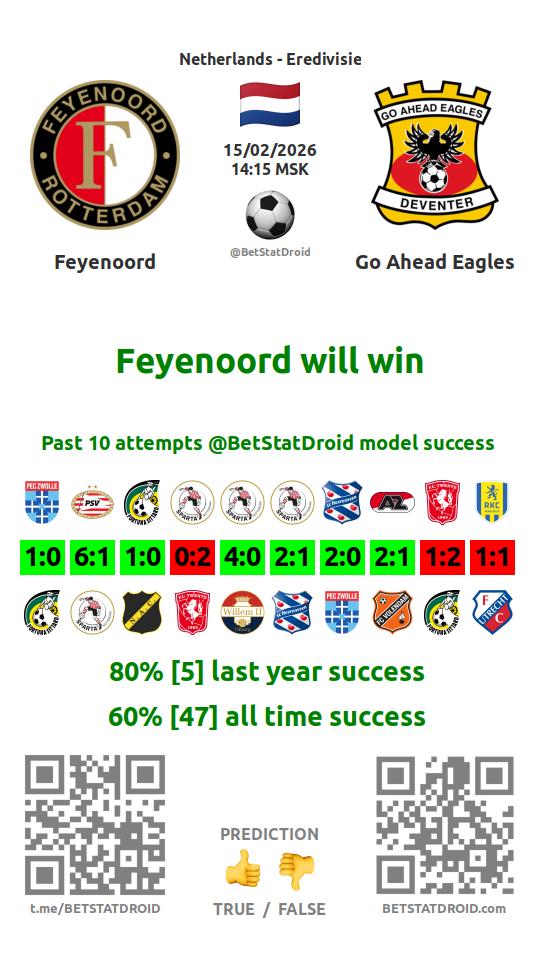 ✔ Фейеноорд забивает больше 1,5 голов в 5 матчах