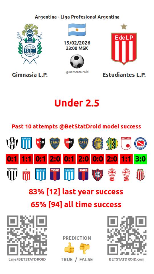 ✔ Химнасия Ла-Плата пропускает меньше 2,5 голов в 15 матчах