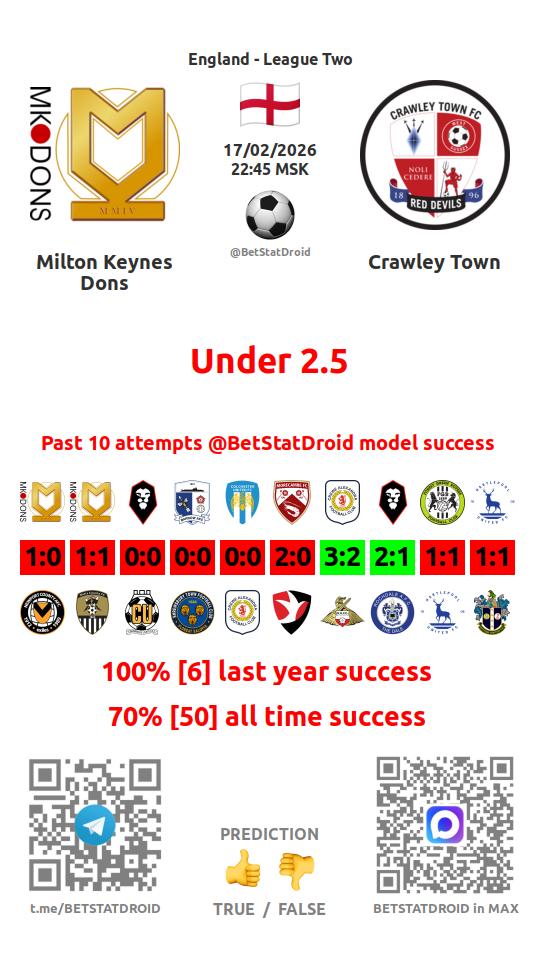 ✔ Кроули забивает меньше 2,5 голов в 14 матчах