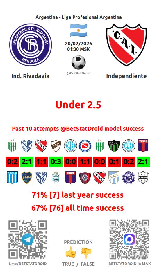 ✔ Индепендьенте Ривадавия забивает меньше 2,5 голов в 20 матчах