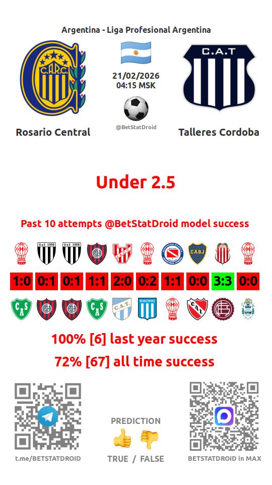 ✔ Росарио Сентраль пропускает меньше 2,5 голов в 41 матчах