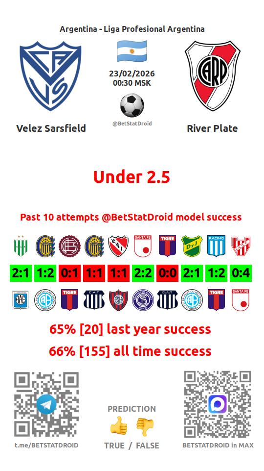 ✔ Велес Сарсфилд пропускает меньше 2,5 голов в 55 матчах