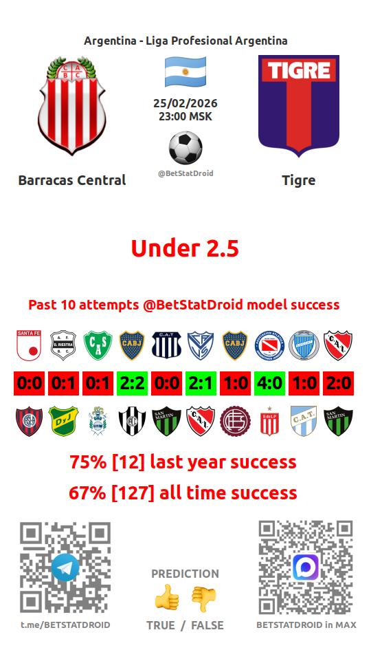 ✔ Барракас Сентраль забивает меньше 2,5 голов в 20 матчах