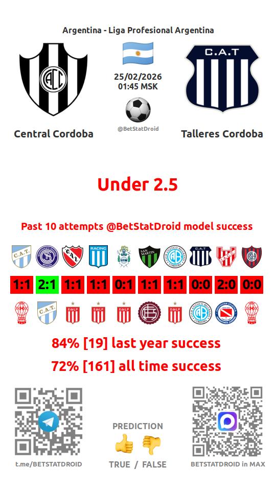 ✔ Сентраль Кордоба пропускает меньше 2,5 голов в 25 матчах
