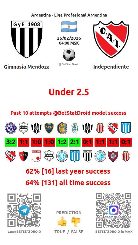 ✔ Химнасия Мендоса забивает меньше 1,5 голов в 7 матчах